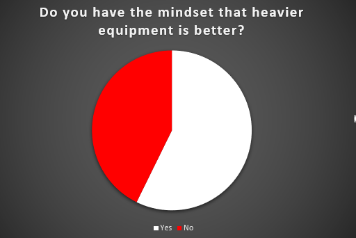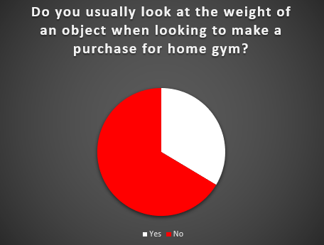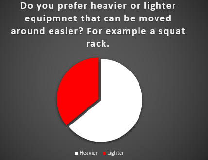 The next three questions revolve around the weight of gym equipment. For the most part, respondents do prefer heavier equipment, but only 34% said the weight of an item when looking to make a purchase. This topic originated from the product department of a fitness manufacturer.