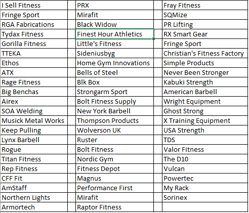 The list was large. Below you’ll see a list of all the companies that did get a response. This does not include the companies that responded with themselves :). Also, keep in mind that some of these are pretty popular companies, but listed out all responses regardless. The most common answers were I Sell Fitness, Rep Fitness, and Bells of Steel.