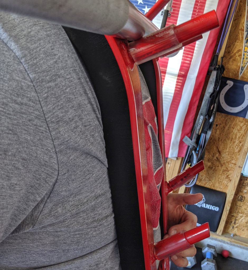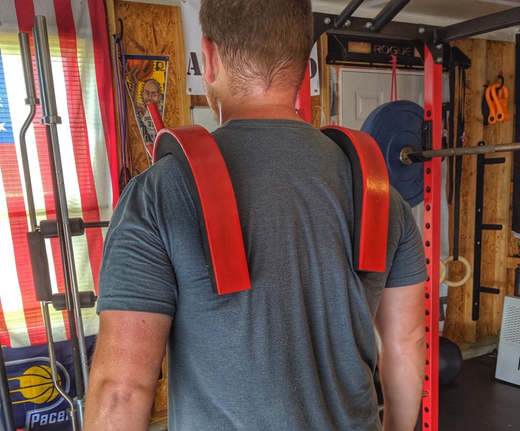 Many of you may be asking, what is that thing in the pic above? Well, it’s a Front Squat Harness, and it’s not something you see in most gyms. This device goes over the shoulders and you set a barbell on the “notches.” It’s best known to help with front and zercher squats. It can also be used for lunges, good mornings, and calf raises, so don’t let the name fool you. It can be used for more than just front squats.
