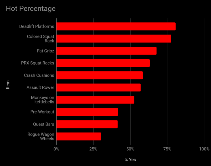 Last week’s survey simply asked whether 10 different items were “hot or not?” Deadlift platforms came out on top and Rogue Wagon Wheels were at the bottom. Here is a breakdown of each item and some info on where to find them: