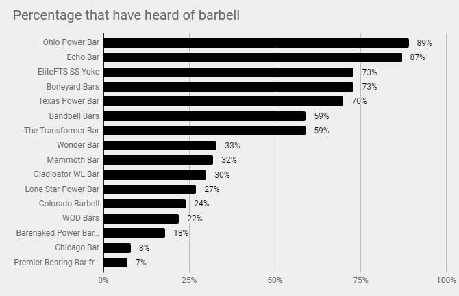 Last week’s survey simply showed a set of barbell pictures and asked if you’ve heard of them before. The Ohio Power Bar, Echo Bar, and even the Boneyard Bars from Rogue were recognized most. You’ll find a breakdown of each barbell below.