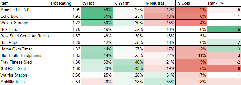 - The Monster Lite 3.0 placement did not move. It stayed on top. The Echo Bike and Weight Storage stayed in the top 3 as well. These three had the highest percentage vote for “hot.”