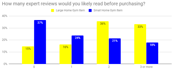 How many “expert reviews” would you likely need to read before purchasing a large home gym item and a small home gym item? For large home gym items, 69% of respondents would like to read 2-3 expert reviews, whereas just 39% need more than 2 for smaller items. Only 15% say they would not read an expert review for a large home gym item.