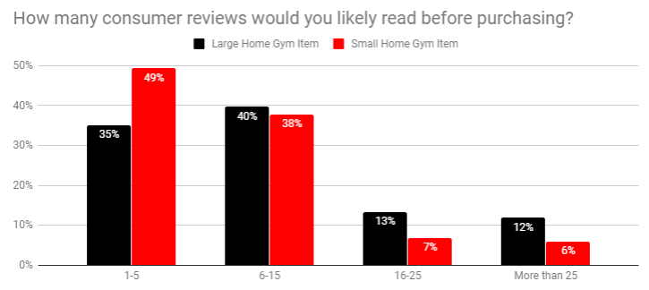 How many consumer reviews would you likely need to read before purchasing a large home gym item and a small home gym item? For large items, the most popular answer was 6-15. Only 35% say that 1-5 reviews would be good enough. With smaller items, the percentages shift down a little bit. About half say that they’d only read 1-5 reviews before purchasing a small home gym item.