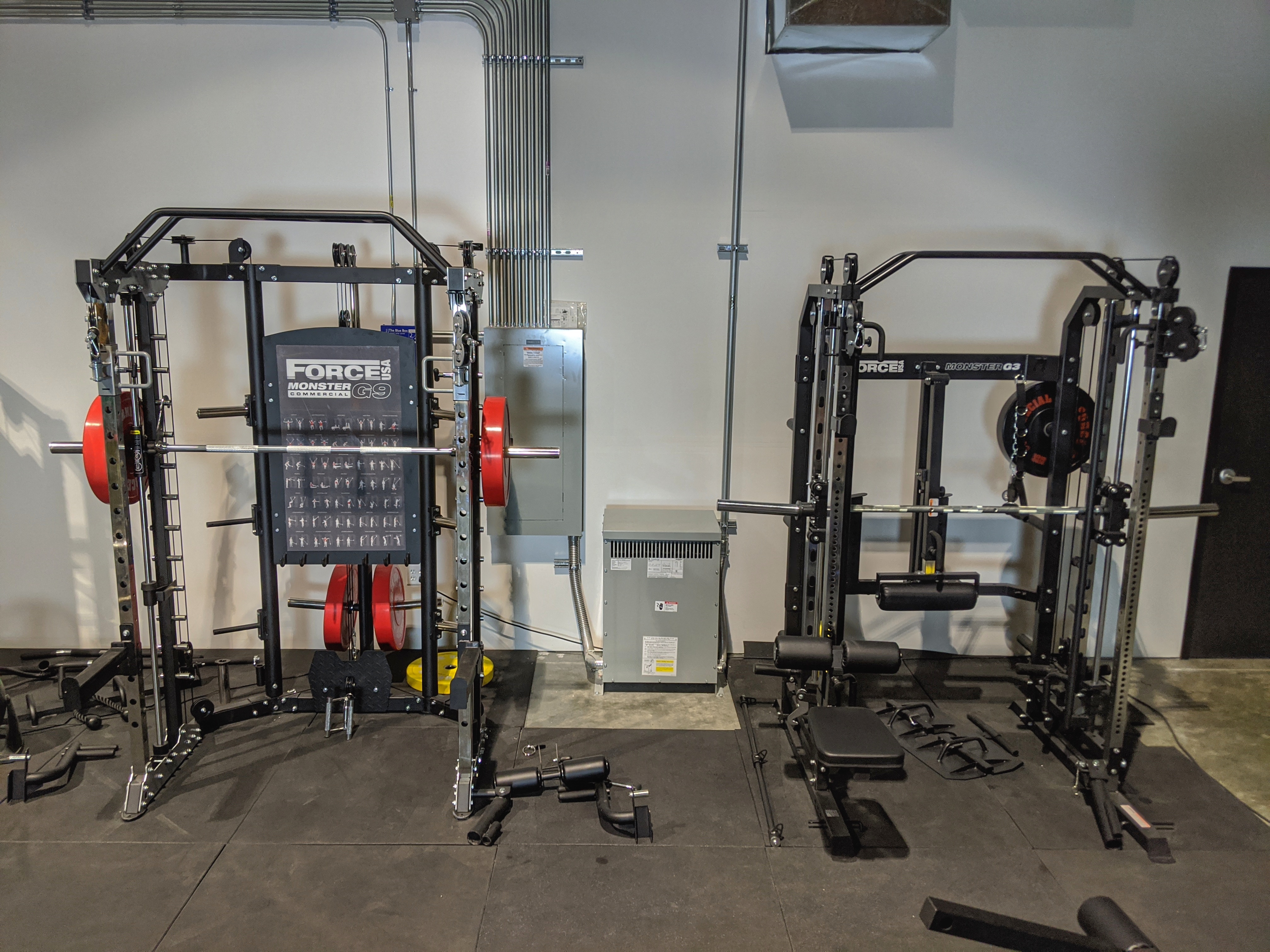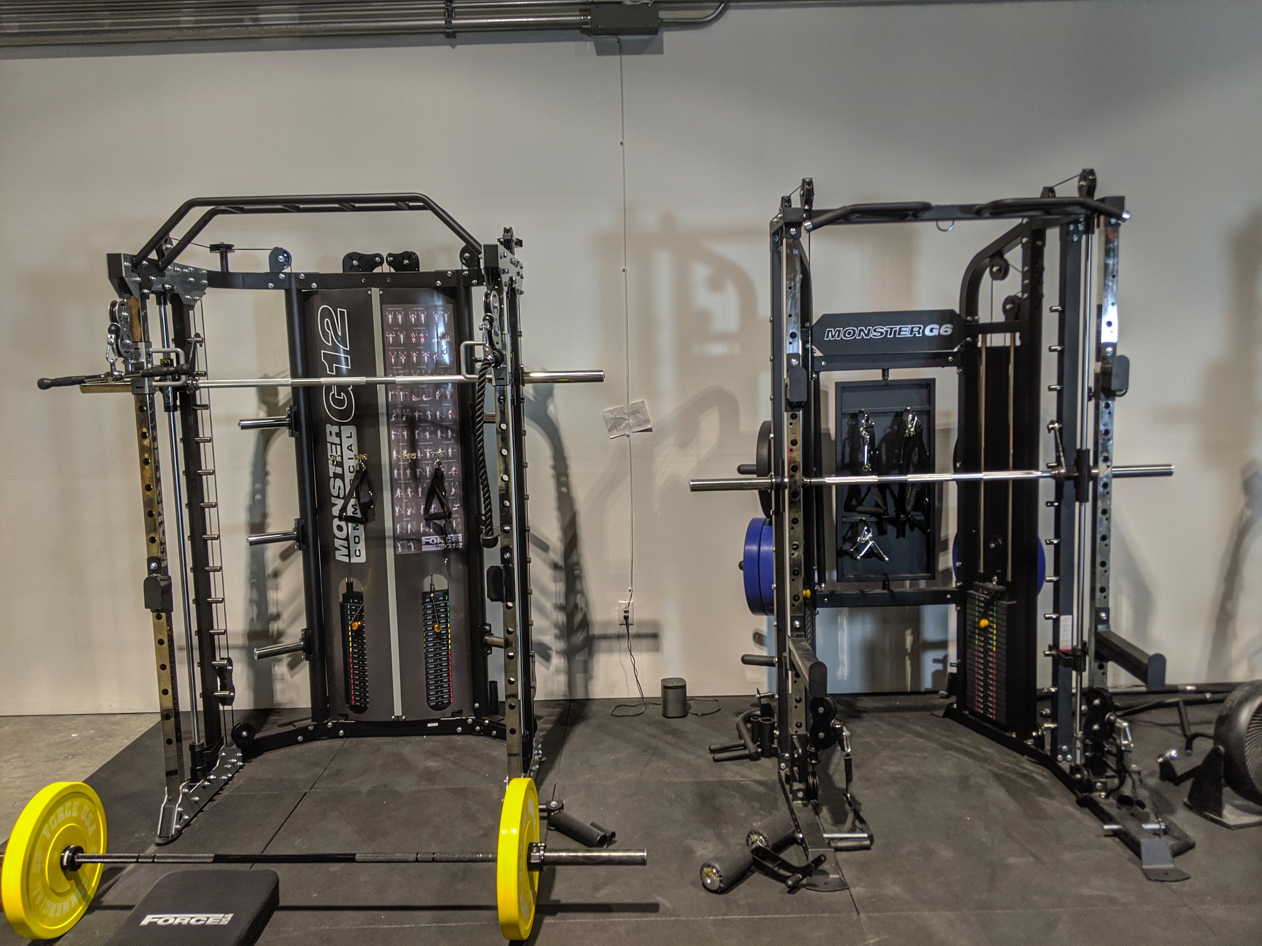 These are designed to be used with bumpers or plate weights. They are all-in-1 machines that will each include a large number of “training tools” in one compact unit. The Monster G3 is the little brother of the Monster G9 Commercial, but still provides “5 machines in 1” with a power rack, functional trainer, smith machine, chin-up station, landmine station, and other optional attachments like a leg press. The G9 would also include a low row, dip station, lat pulldown bar, and vertical leg press. Both include multiple storage options as well so everything you may need would fit directly on the machines.