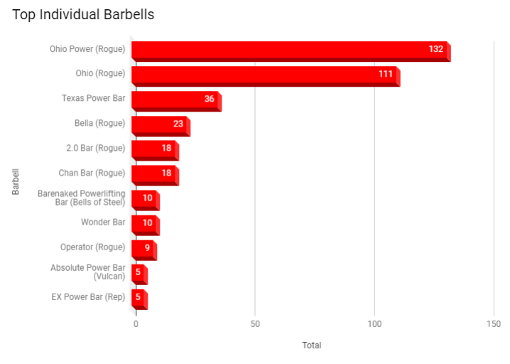 When looking at specific barbells, there were a little over 500 total responses. There were two barbells that stood out above the rest. The Ohio Power Bar made up 25% of total responses and The Ohio Bar was 4% points behind. A breakdown of the top 10 mentioned bars is below.