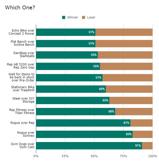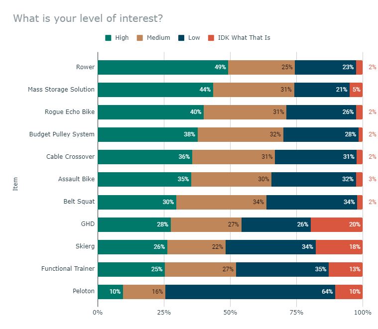 - The Rower, Mass Storage Solution, and Rogue Echo Bike were the items survey respondents were most interested in.