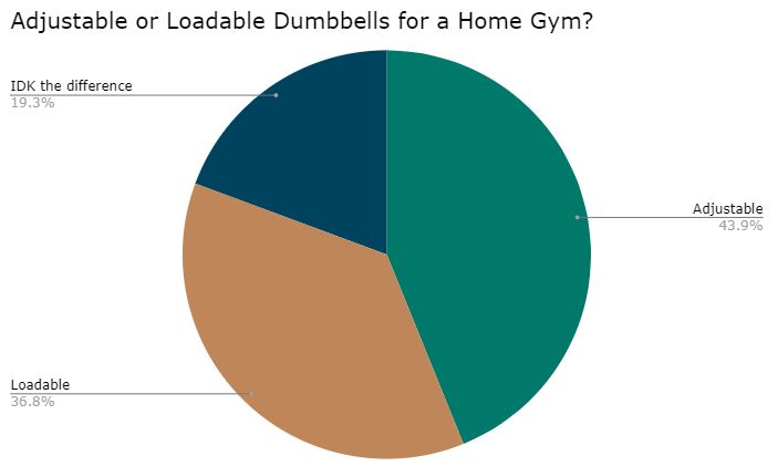 Adjustable or Loadable Dumbbells? This is a pretty close one. In a head to head matchup 44% voted for adjustable, 37% for loadable, and 19% didn’t know the difference.