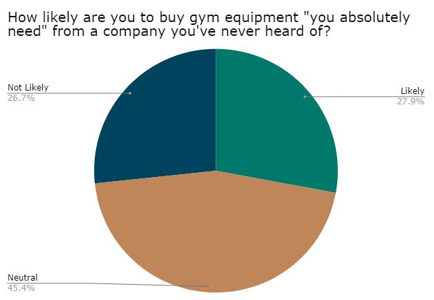 How likely are you to buy gym equipment “you absolutely need” from a company you’ve never heard of? Over 45% are neutral on this question and the rest of the votes are basically split between likely and not likely.