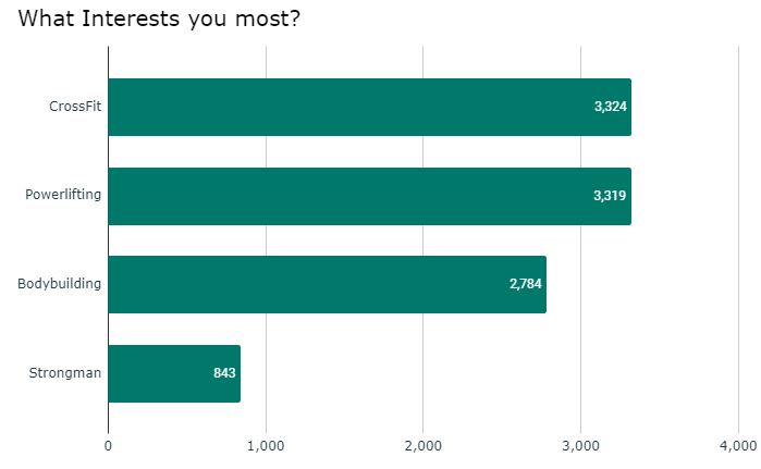 Powerlifting, CrossFit, Bodybuilding, or Strongman… What interests you the most? In this poll, CrossFit is the winner, slightly beating out powerlifting by just 5 votes (over 10,000 total votes). This question got many “Oly Weightlifters” upset because they were not on the list. HA! Sorry about that. There are only 4 possible choices with how the polls are done so someone is usually left off.