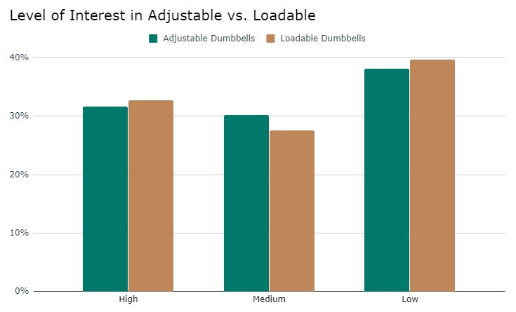 Then, when breaking it down to the “level of interest,” loadable dumbbells actually had a more “high level of interest” votes. Overall, it seems like this comparison is a toss up.
