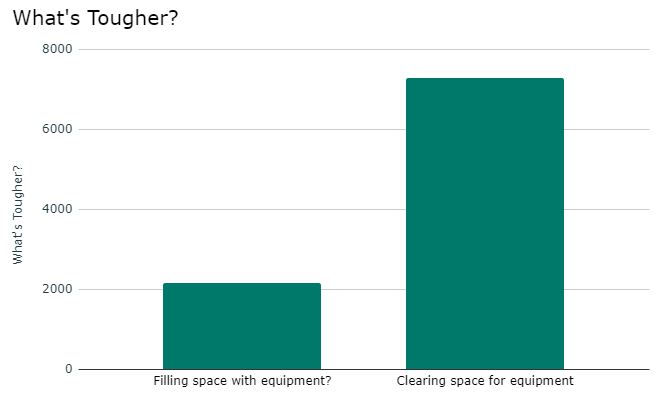 3.4x more people said it was more difficult to clear space for equipment than fill it up. This question has been asked several times during these surveys and the results have been very consistent.
