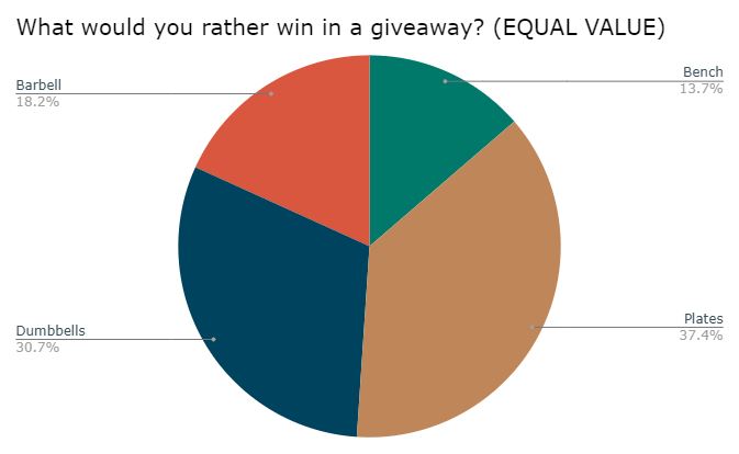 What would you rather win in a giveaway – a bench, plates, dumbbells, or a barbell? The winner here is plates with dumbbells not too far behind.