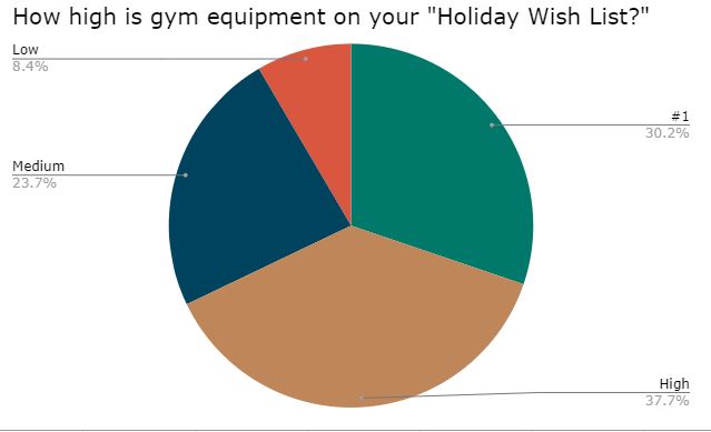 To those filling out these surveys, gym equipment is extremely high on their “Holiday Wish List.” Nearly 68% rated it as high or #1 with only 8% voting low.