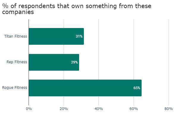 65% of respondents said they own something from Rogue, 31% from Titan Fitness, and 29% from Rep.
