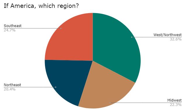 The Southeast/Northeast combined for about 45% of votes for those in America. There were several people from Texas that just responded saying they were from Texas. I guess they didn’t identify with any of the regions?