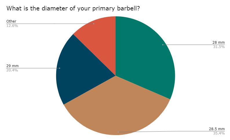 51% say they know the diameter of their primary barbell. 49% do not. Below are the results of those that do know. The most widely used diameter is 28.5 (probably as expected) with over 35% of the votes.