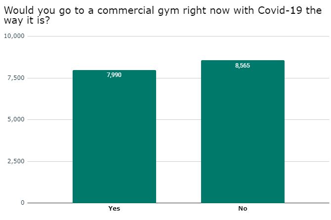 Just under half (48%) of survey respondents say they would go to a commercial gym right now. This was also asked in an Instagram Post (huge thanks to all who participated) where the responses were pretty much 50/50. Overall, it’s a toss-up. Some of the themes included: