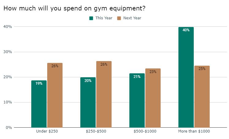 Survey respondents expect to spend a little less on gym equipment next year. For example, 40% said they will spend over $1,000 this year, but only 25% are predicting the same for next. Below is a look at what people expect to spend this year vs. next.