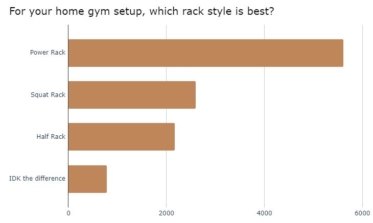 For your home gym setup, which rack style is best? Power racks make up just over half of the votes, with squat racks in a distant second place. About 7% don’t know the difference between power, squat, and half rack.