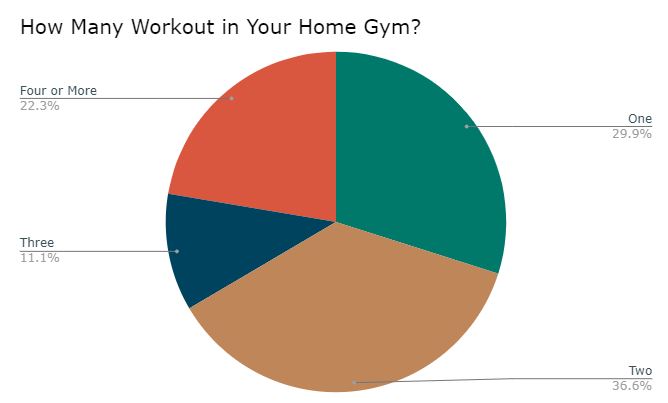 How many workout in your home gym? It’s probably shocking to some that it’s not just the household’s meathead that is utilizing the gym. Only 30% of respondents said one person utilizes the gym, while over 22% have four or more. The most popular answer was two, with nearly 37% of the votes.