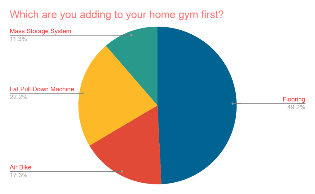 What are you adding to your home gym first (Flooring, Air Bike, Lat Pull Down Machine, Mass Storage)? Flooring, which could be described as a “Home Gym Essential,” easily wins this one with nearly half of the total votes. The lat pull down machine beat out the air bike by a decent margin for second place, and mass storage came in last.