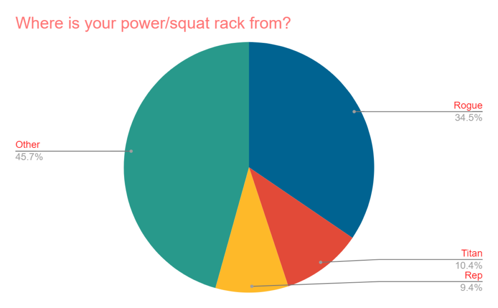 After finding out how many owned racks, it was asked, “Where is your power rack from?” Rogue led the way with about 35% of the votes, while Titan and Rep combined for an additional 20%. “Other” was picked about 46% of the time.