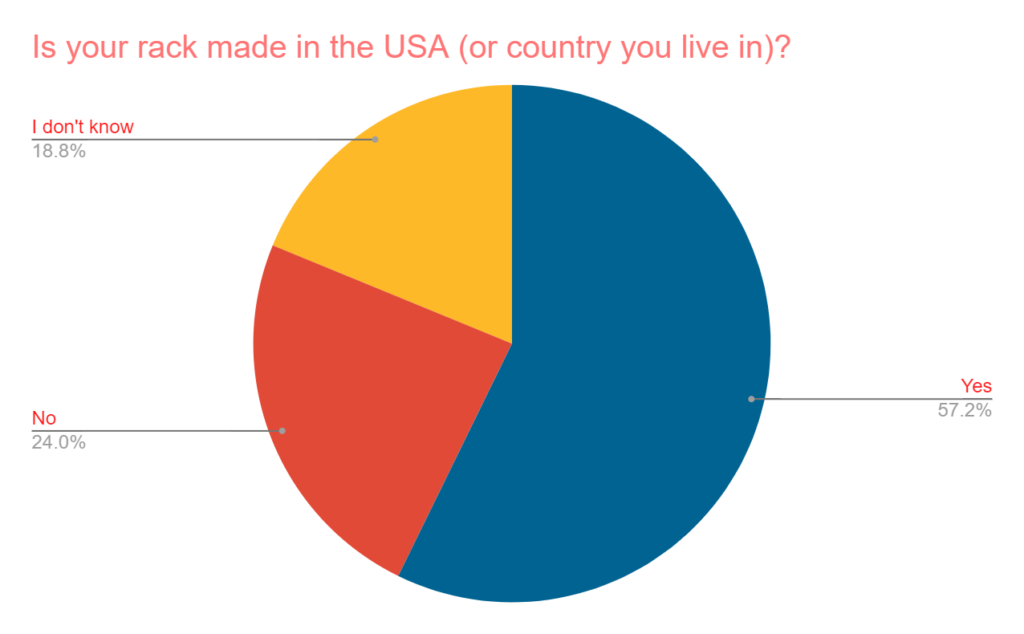 Most say that the racks they own are made in the in USA or the country they live in, while about 19% have no idea where there rack was made.