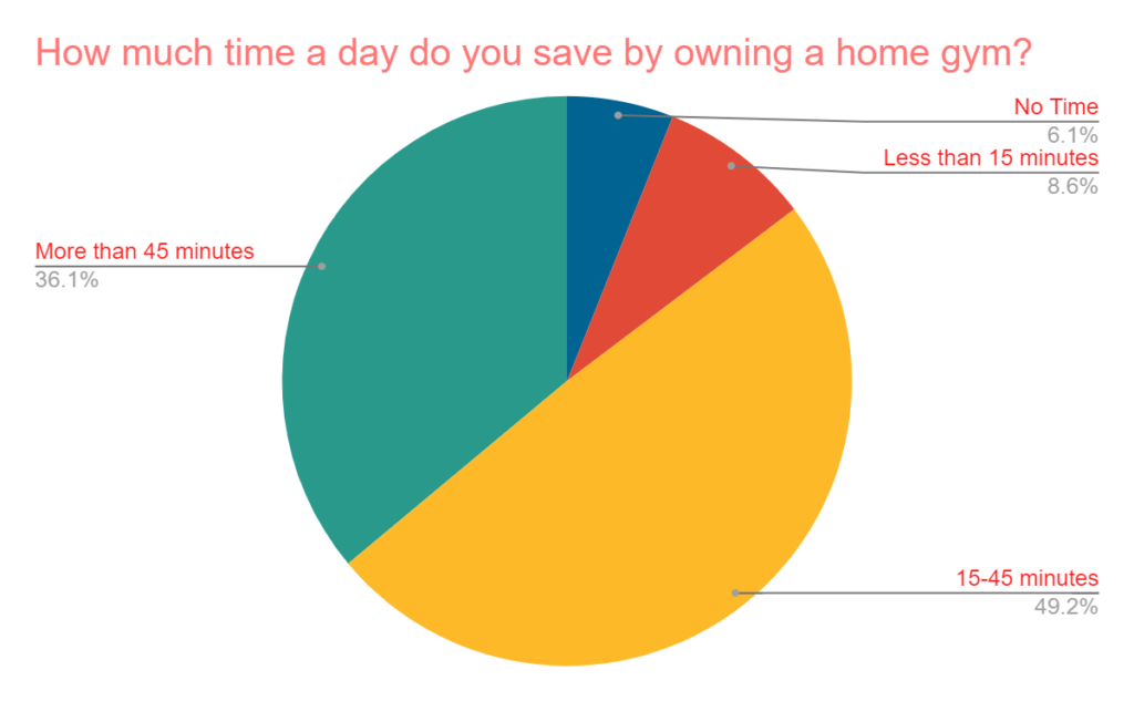 Quite a bit of time is saved by owning a home gym. 85% said they saved at least 15 minutes a day. If you are able to save 15 minutes a day and multiply that by 365 days a year, you’ll ultimately end up saving over 91 hours of your precious time.