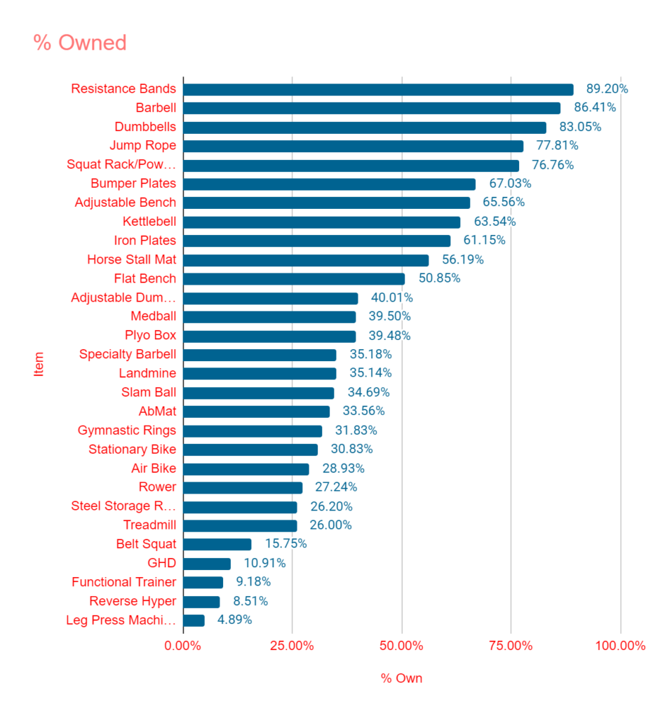 • Resistance bands came it at #1 with 89% owning. A barbell fell just behind (86%) and dumbbells were the third most owned product (83%).