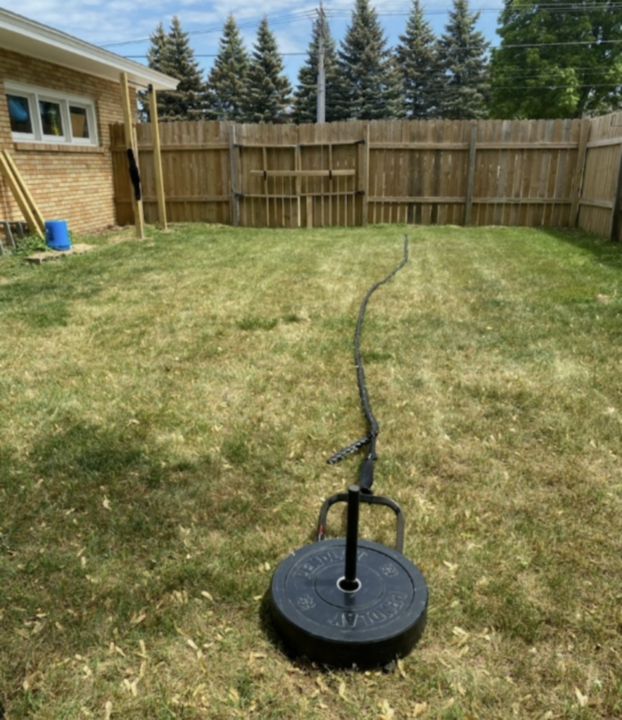 - Pull-up Bar: Bodyweight movements and outdoors just seeming to go together. Arguably the best bodyweight movement is the pull-up, and having an outdoor set-up may be just what you need to get outside. You can go with multiple set-ups, from freestanding towers or even wall-mounted options for the side of your house/garage. We went with a DIY set-up using 4×4 posts and this bar option from Amazon. This bar (which comes with lag-bolts) costs $55. With current lumber prices and the cement needed, you’ll spend about $80, and that will get you a bar height up to 10’. DIY instructions can be found here.