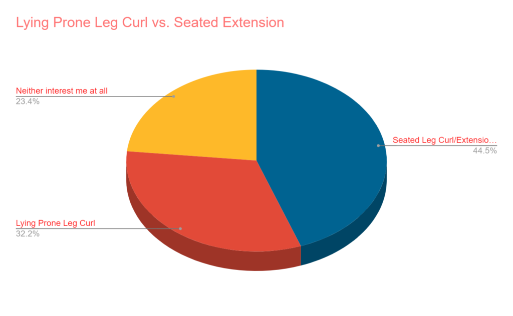 In a battle of leg machines from Titan, the Seated Leg Curl received 38% more votes than the Lying Prone Leg Curl. Only 23% said they had no interest in these machines at all.