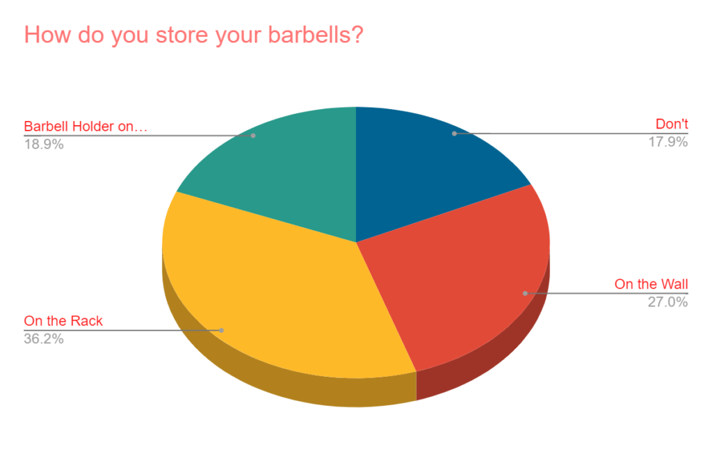 Most that own barbells are storing them in some way. The largest vote-getter was “on the rack” (36%) with “on the wall” in second (27%). 19% use a barbell holder on the ground, and 18% do not store them at all.