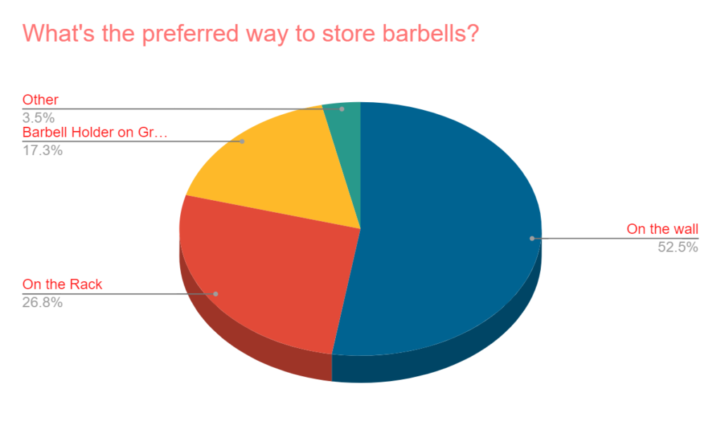 Then, it was asked, “what’s the preferred way to store barbells?” “On the wall” made up over half of the responses while “on the rack” fell over 9 percentage points.