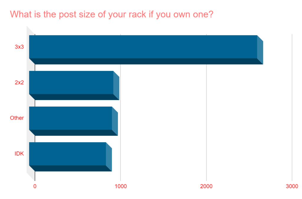 Nearly half say the post size of their rack is 3×3, with another 18% using the more budget-friendly 2×2 tubing. 16% are clueless on this topic.