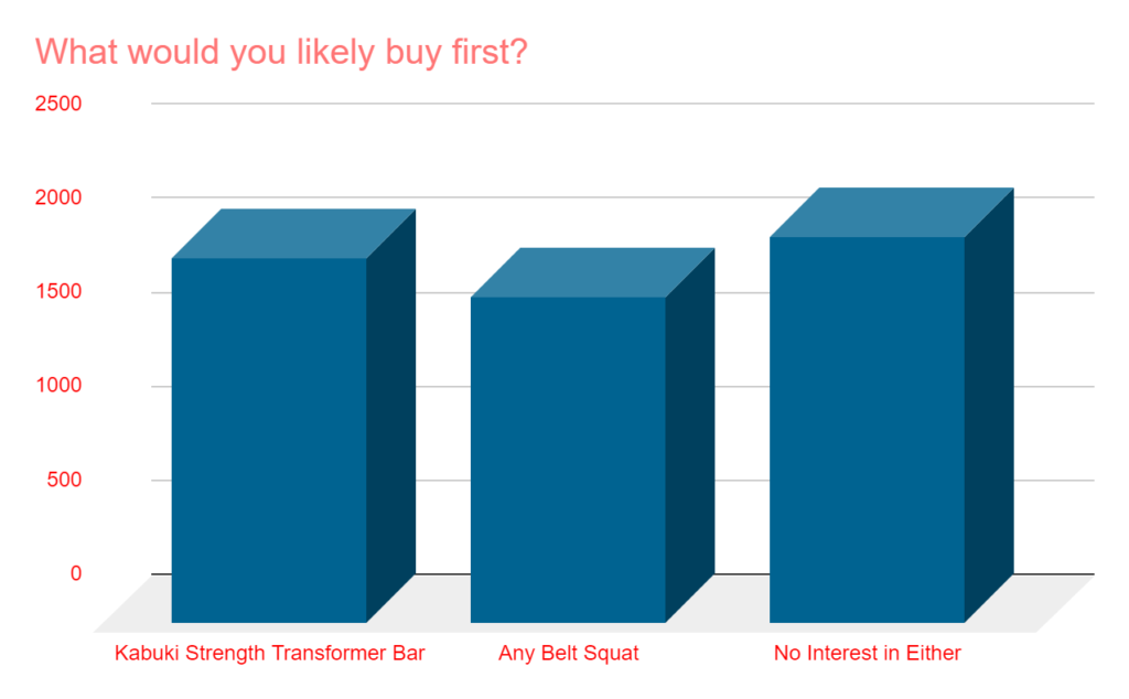 What are you likely to buy first? The Kabuki Strength Transformer Bar or a belt squat? The winner for this poll was “no interest in either.” However, about 2 out of 3 voted for one of these items, with the Kabuki bar beating out belts squats by 4% points (34% vs. 30%).