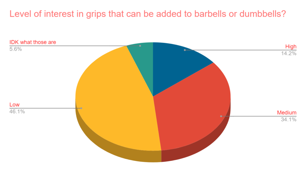 The level of interest in grips that can be added to barbells or dumbbells (like Fat Gripz) is not extremely high. Only 14% said they had high interest, and nearly half said “low interest.”