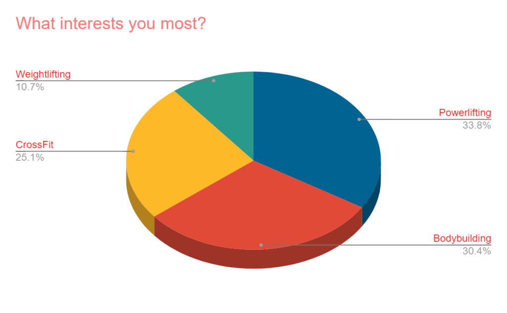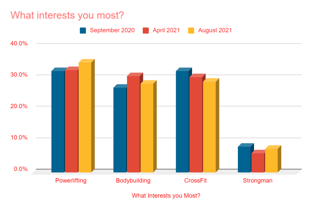 There were two “what interests you most” questions that varied slightly. In the first, it was a comparison between powerlifting, bodybuilding, CrossFit, and Strongman. Some notes: