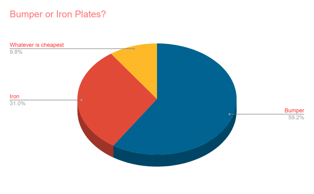 Bumper or iron plates? Consistent with most polls done in the past, bumper plates are the easy winner with 59% of the total votes. Iron made up a little less than one-third of voting and “whatever is cheapest,” 10%.