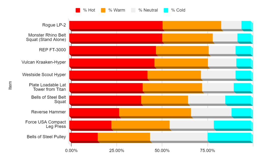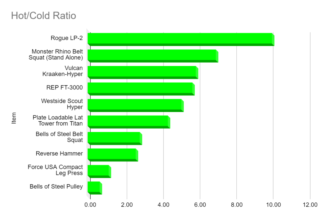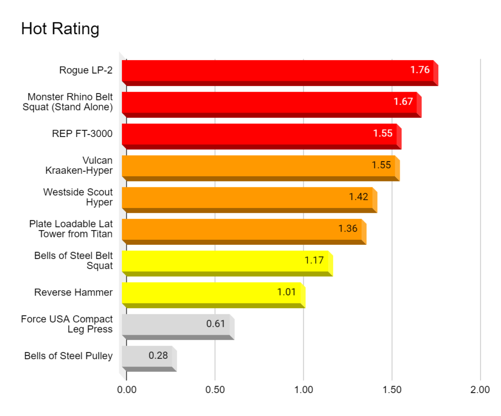 - The Rogue LP-2 beat out the Monster Rhino Belt Squat (Stand Alone) for the top spot. These were the only two with over 50% voting “hot.”