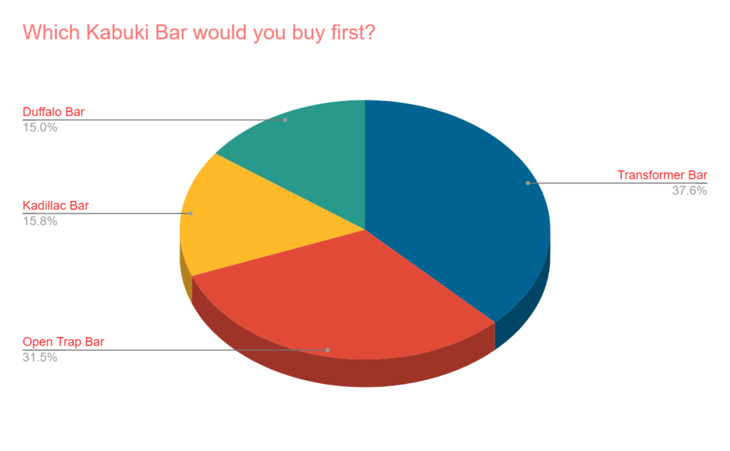 However, the Open Trap Bar was not too far behind with almost 32%. Both received more than the Duffalo and Kadillac bar combined.