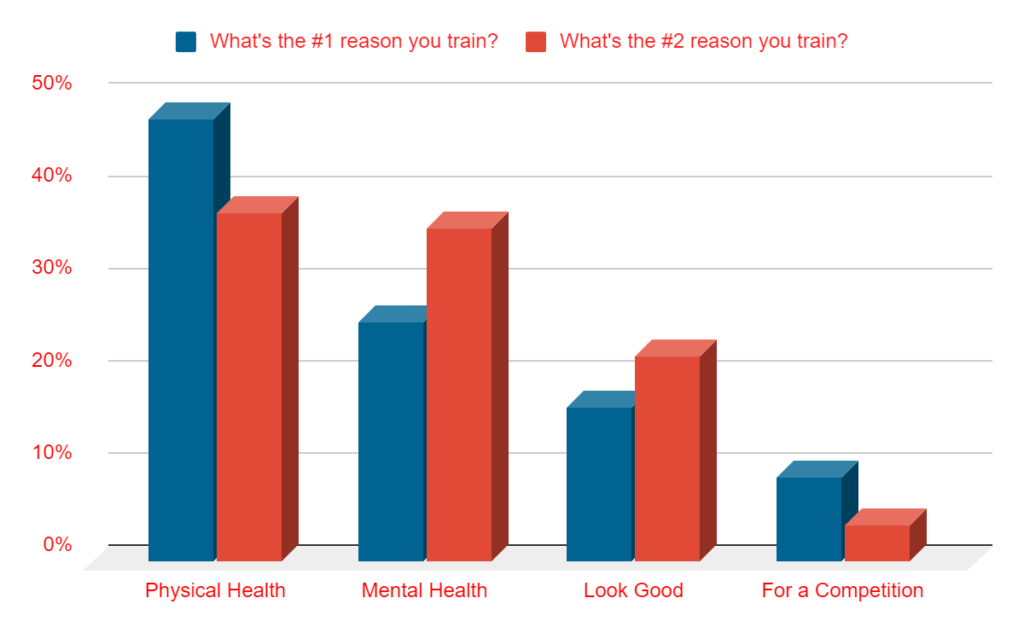 - With the four options availalbe to choose from (in the chart below), physical health was easily the number one reason someone trains with mental health being the second. These two responses made up about 75% of total responses for both question.
