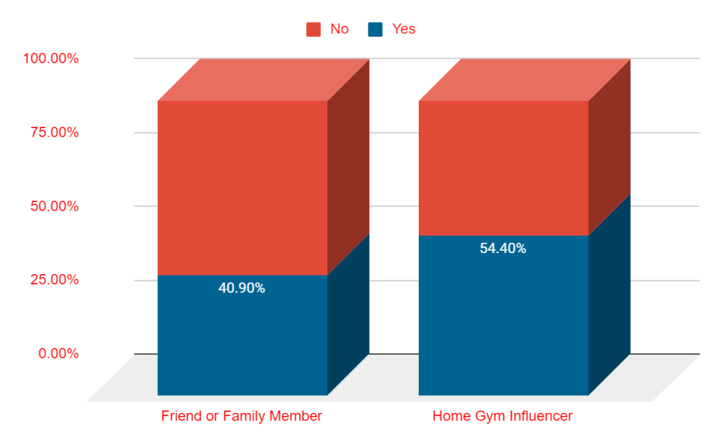 - About 41% they’ve made a gym equipment purchase based on a personal recommendation from a friend or family member, while 54% say a recommendation from a “home gym influencer” has influenced them to make a purchase.