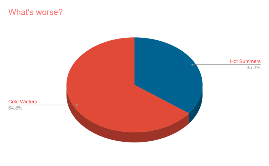 - Without question, this just depends on where you live, but about 65% say cold winters are tougher than the hot summers (35%).
