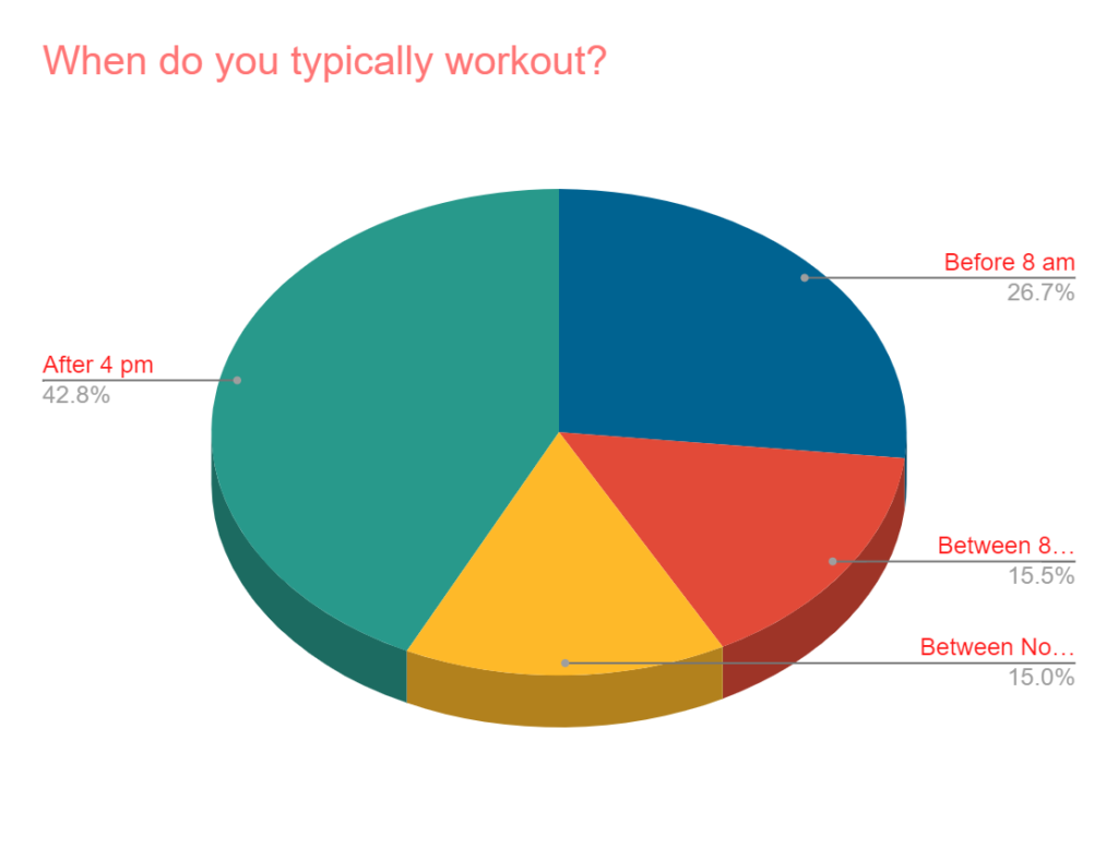 - Evenings are the most popular workout time. 43% are working out after 4 pm, 27% before 8 am, and 31% during the day. This aligns pretty well with a survey accomplished in April of 2019.