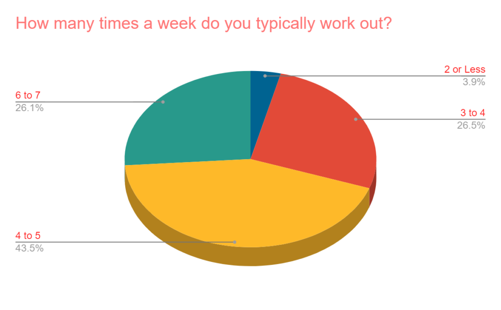 - This is an active group with only 3.9% workout out less than 3 times a week. About 70% are workout out at least 4 times.