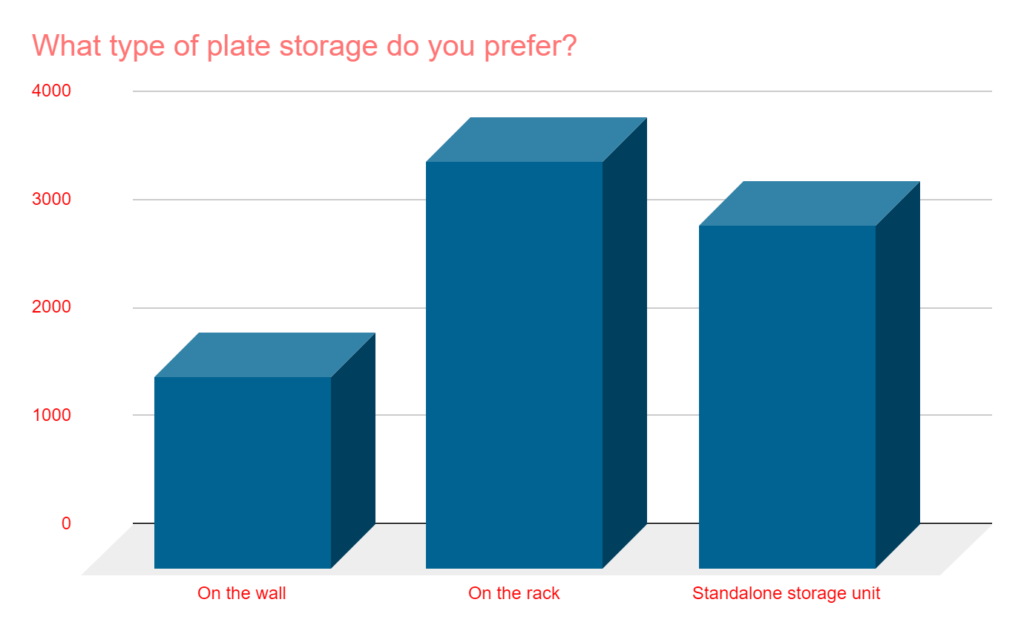 - In a battle of “plate storage options,” the rack wins with 43% of total votes. A standalone storage unit came in second with 36%, and only 20% voted for on the wall.