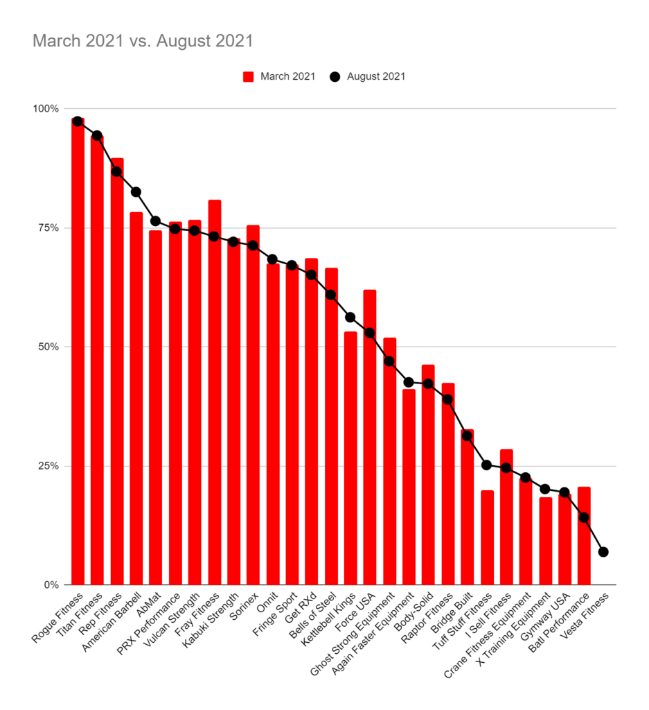 - Since March the top 4 did not change with Rogue, Titan, REP, and American Barbell staying in their spots. AbMat slid in to the top 5 after being ranked #9 in March. AbMat rose 3% while others fell.