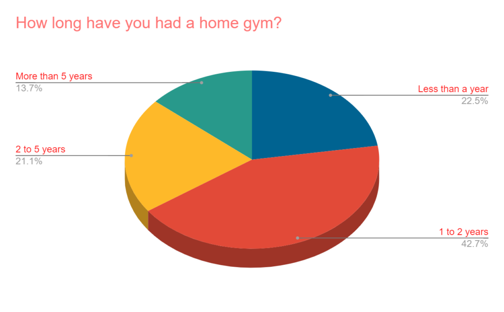 - Many haven’t had a home gym for too long. Only 14% of respondents have had a home gym for more than five years. About 43% began one within the last year or two, probably due to COVID-19.