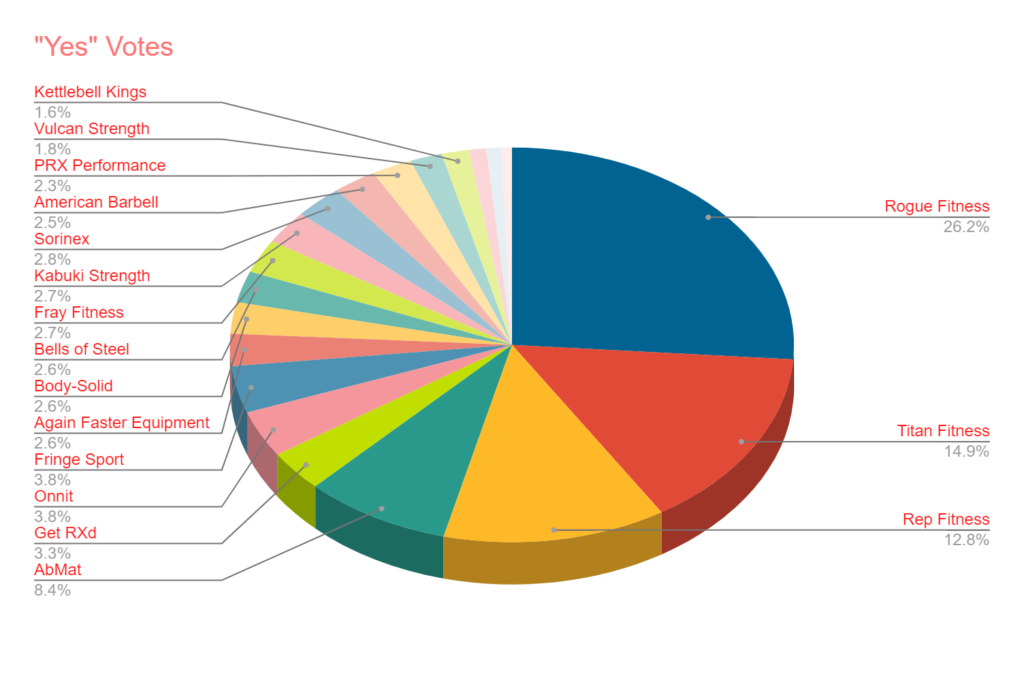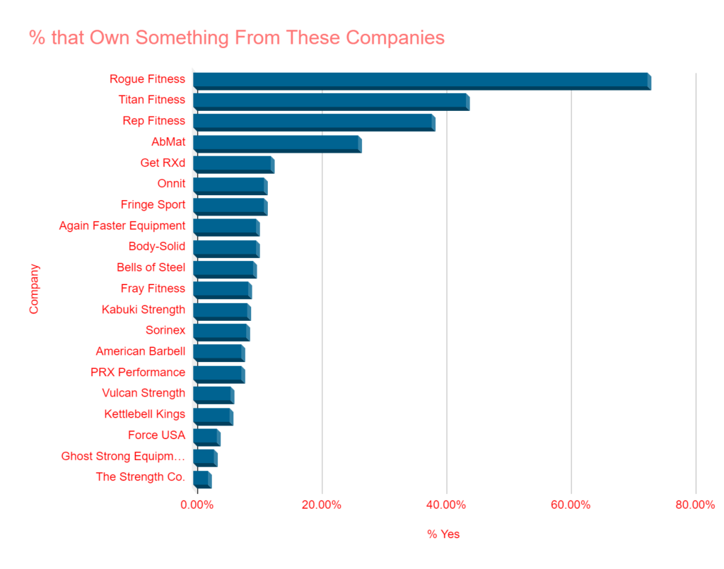 - An astounding 73% said they owned something from Rogue Fitness. With a total of 7,920 “yes” responses, they make up over 26% of all “yes responses. That’s domination.